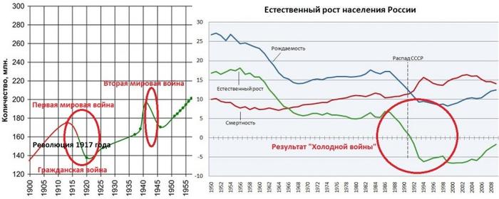 Если обратить внимание на тенденции, то через 15 лет после Великой Отечественной Войны численность населения СССР вернулась к довоенной цифре. А от последствий «Холодной войны» Россия не оправилась до сих пор! Лишь 2 года назад рождаемость в России превысила показатели смертности!!!