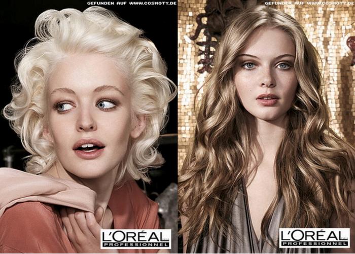 Две фотографии и цитата с сайта «Она знает»: «Не важно: были ли вы РУСОЙ с рождения или стали ею после посещения салона красоты. Мы поможем вам всегда оставаться сияющей и яркой. В общем, настоящей русоволосой девушкой!»