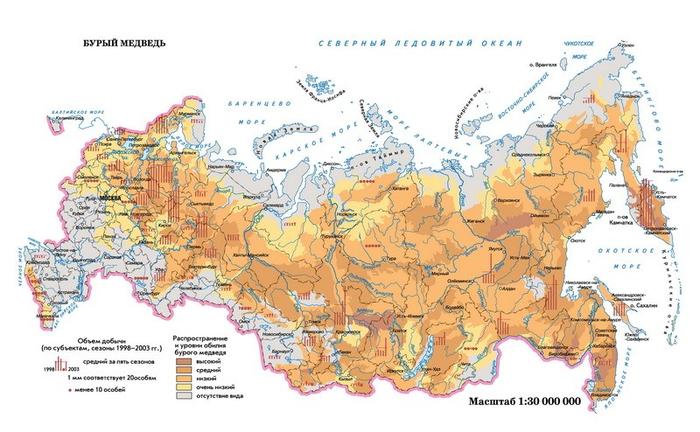 Интересно в этой трактовке зоологии посмотреть на ареал распространения бурого медведя хотя бы в пределах Российской Федерации. Вот карта. Всё закрашенное коричневым цветом — места обитания бурого медведя.