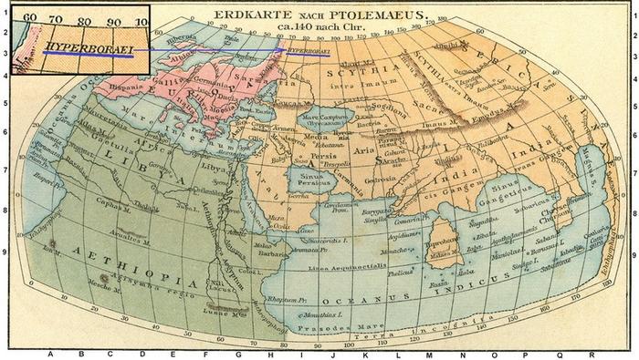 А где находилась эта самая «страна гипербореев», хорошо видно, если мы посмотрим на карту Птолемея, позднеэллинистического астронома, астролога, математика, механика, оптика, теоретика музыки и географа. Он жил и работал в Александрии Египетской, где проводил астрономические наблюдения.