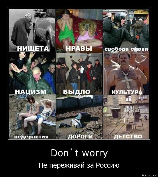 КОР: - Немного об особенностях психологии россиян и о Вашей категоричной оценке этого народа. Вашу ненависть к России разделяют миллионы честных русских людей, которые называют РФ разными уродскими словами, типа "говнорашка" и "российская пидерация". Но парадокс заключается в том, что они там живут и никуда уезжать не собираются. Я помню себя в юности (время после Перестройки). Меня всегда со школьной скамьи раздражали те условия жизни, которые были в России. Переполненные автобусы, постоянные очереди, постоянная нехватка одежды, денег и т.д. Я всегда хотел уехать из того кошмара и, как только представилась возможность - уехал. С двумястами долларами в кармане, в полную неизвестность, но с решимостью избавиться от российского кошмара. Я звал многих с собой, но они предпочли ту действительность неизвестности. Где-то на кухне они могут ругать Путина, евреев, хачей, кого угодно, но на какие-либо действия ради своей свободы большинство из них не способны. Петр Хомяков в одной из своих книг назвал это состояние стокгольмским синдромом, когда жертвы начинают чувствовать сострадание к своим палачам и даже рвать на себе рубаху за их благополучие и "честное" имя. Так вот, по-вашему, это стокгольмский мазо-синдром или как это можно объяснить?