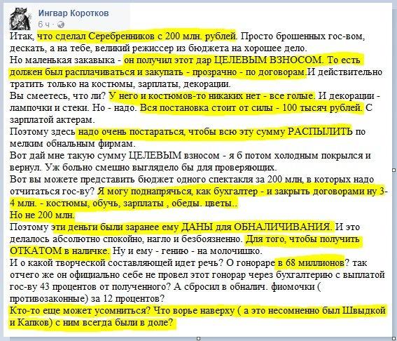 "Сущность договора состоит в том, что вы выделяете нам из бюджетных средств и мы можем их воровать, как угодно. А мы за это вас, конечно, ругаем, но так, с фигой в кармане, не очень сильно, что называется, и не зовем никого на протесты на Болотную. И в этом смысле да, Серебренников – он выдающийся режиссер. Он неслучайно же руководитель "Гоголь-центра". Он поставил… Это была масштабная постановка "Мертвых душ", мы просто не поняли. Вы же помните завязку сюжета "Мертвых душ"? Что Чичиков скупает крестьян у всех этих помещиков для того, чтобы их обналичить в Дворянском банке.