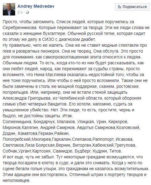 Мы ценим его как талантливого, ангажированного, неподкупного художника и как порядочного человека. Его работы отличают независимость и глубина, в них нередко подвергаются виртуозной критике существующие общественные и политические порядки. Его "Гоголь-центр" в Москве - один из немногих еще оставшихся оазисов свободы слова в современной России..."
