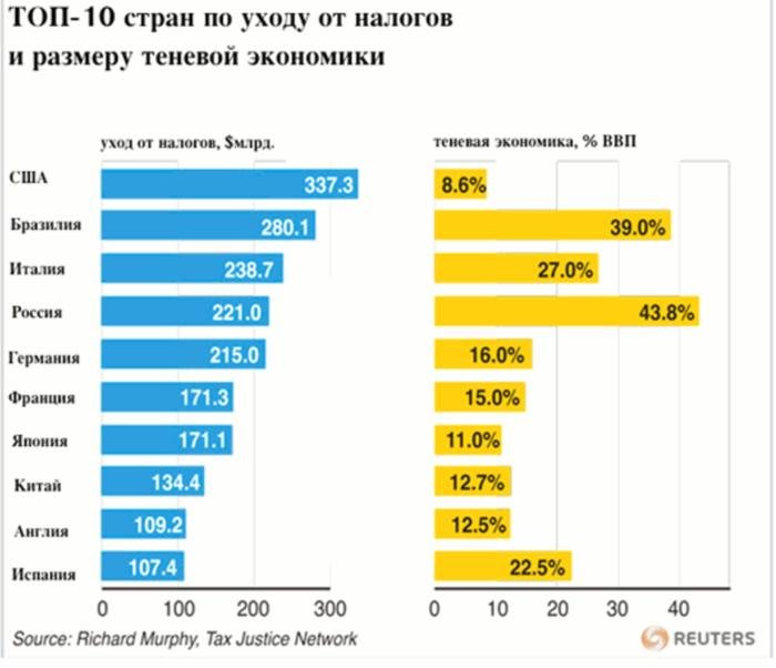 при этом есть один момент... Россия занимает 1-ое место в мире по размеру теневой экономике, около 44% ВВП.