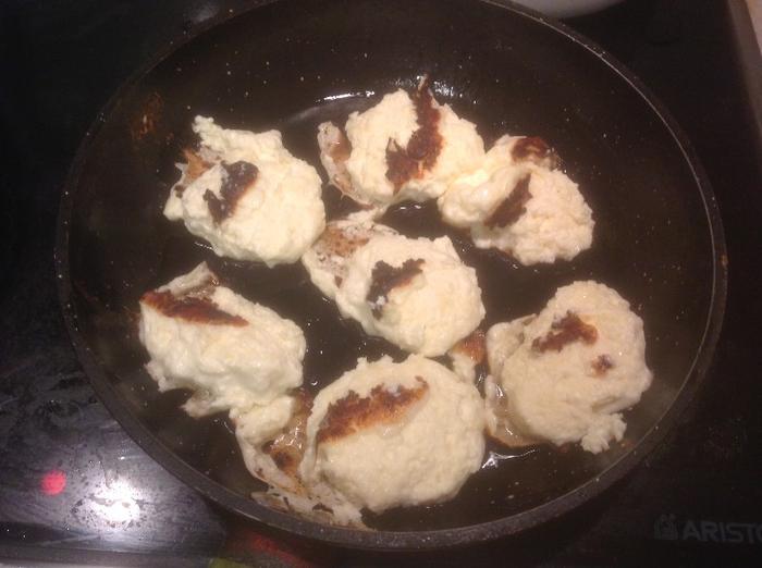 Налей рафинированного масла на сковороду на месколько мм толщиной, разогрей хорошо на среднем огне. Сформируй ложкой маленькие сырнички, выложи в разогретое масло. Накрой сковороду крышкой, но не полностью- оставь хороший зазор, чтоб пар не конденсировался и в масло не капала вода. Подрумянились- значит, готово, переворачивай.