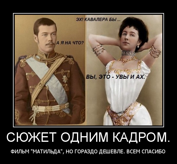 P.S.Беру на себя смелость утверждать, что одним кадром могу поведать сюжет скандального фильма "Матильда". Спасибо всем понявшим меня правильно.