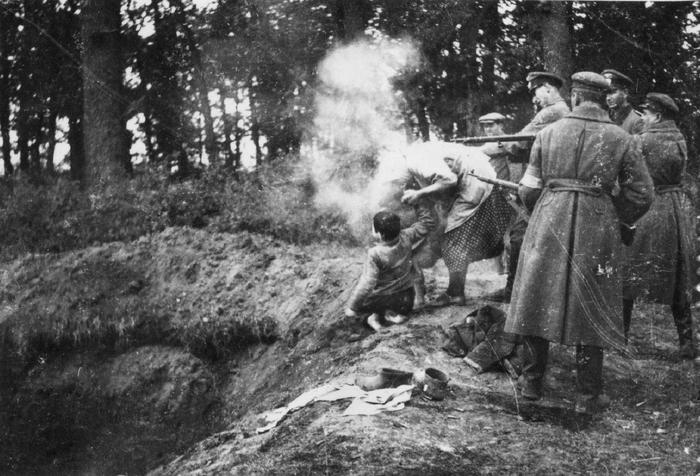 Расстрел производился при помощи местных коллаборационистов (на рукаве одного из них видна повязка).