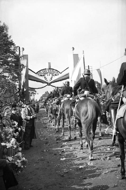 Польские войска оккупируют чешский город Карвина в ходе операции «Залужье». Польская часть населения встречает войска цветами. Октябрь 1938 года.