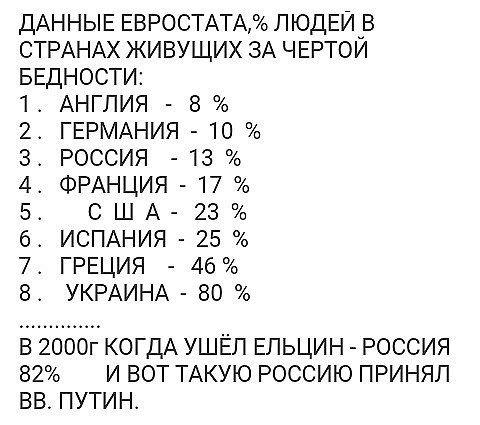 Реально нищих россиян не 20-22 млн человек, а 70-73 млн. (с доходами менее 20 тыс. рублей в месяц). Погром среднего класса, вырезание малого бизнеса, рост нищеты и бедности, люмпенизация и дебилизация населения, агрессивная пропаганда, промывка мозгов, маргинализация и деградация человеческого капитала, рост поборов и налогов, приватизация и рост платности образования, здравоохранения и прочих госуслуг идут полным ходом. Системный кризис идёт вширь и вглу...