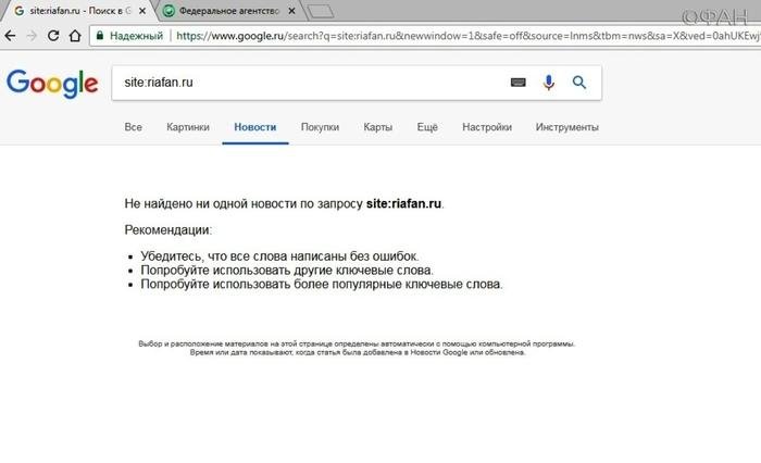 Агентство РИА «ФАН» было удалено из «Google.News». Теперь даже конкретный поисковый запрос «site:riafan.ru» не приводит к какому-либо результату. Удалению подверглись не только свежие материалы агентства, но и архив новостей с момента создания РИА «ФАН».