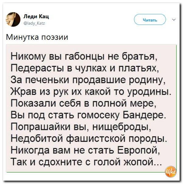 "... Скажи этому чесоточному кошаку, я в ЧС, что украина незаконно занимает наши территории. ..."