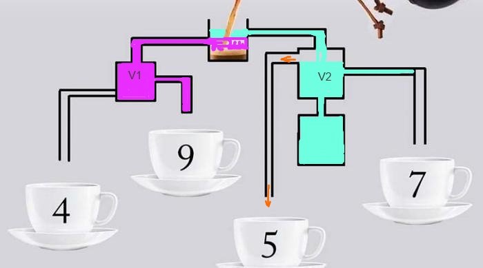 т.к для того, что бы полилось в единственную доступную чашку 5 необходимо заполнить объёмы V1 и V2