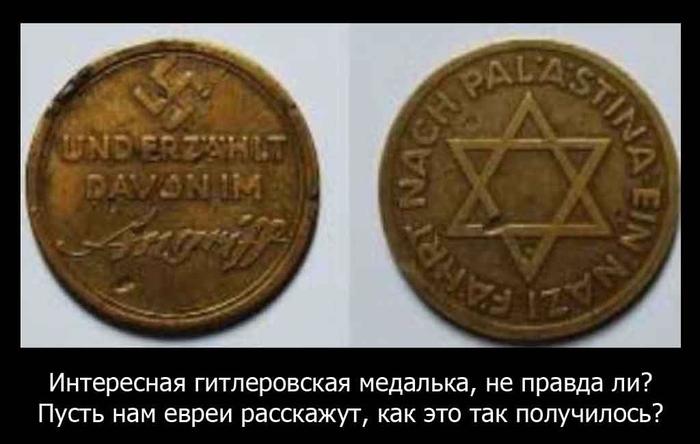 Про нацистско-сионистский жетон (а не медальку): на аверсе надпись "EIN NAZI FÄHRT NACH PALÄSTINA" (один нацист едет в Палестину) на реверсе надпись "UND ERZÄHLT DAVON IM Angriff" (И РАССКАЗЫВАЕТ о НИХ В атаку), Angriff это название газеты.