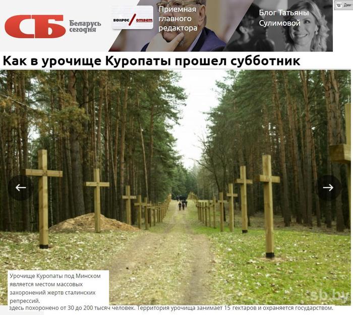 "Количество жертв на сегодняшний день остается точно неизвестным и, в соответствии с разными оценками, может составлять: до 7 тысяч человек (по данным, озвученным Генеральным прокурором Республики Беларусь О. Бажелко)[1], не менее 30 тысяч человек (по данным, озвученным Генеральным прокурором БССР Г. Тарнавским)[2], до 100 тысяч человек (в соответствии со справочником «Беларусь»)[3][4], от 102 до 250 тысяч человек (по данным статьи Зенона Позняка в газете «Літаратура і мастацтва»)[5][6], 250 тысяч человек (по данным профессора Вроцлавского Университета Здислава Винницкого)[7] и более (по данным британского историка Нормана Дэвиса)[8]."