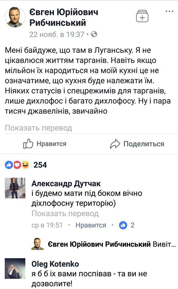 Напомним, в сети разгорелась дискуссия из-за нового поста Евгения Рыбчинского, датированного 22 ноября, в котором тот заявлял: "Мне все равно, что там в Луганске. Я не интересуюсь жизнью тараканов. Даже если миллион их родится на моей кухне, это не будет означать, что кухня будет принадлежать им. Никаких статусов и спецрежимов для тараканов, только дихлофос и много дихлофоса. Ну и пара тысяч Джевелинов, конечно".
