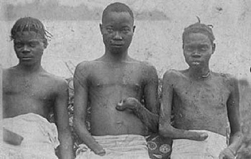 Мужчина смотрит на руки своей пятилетней дочери, отрезанные в наказание за плохо выполненную работу по сбору каучука, Конго, конец XIX века