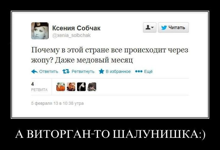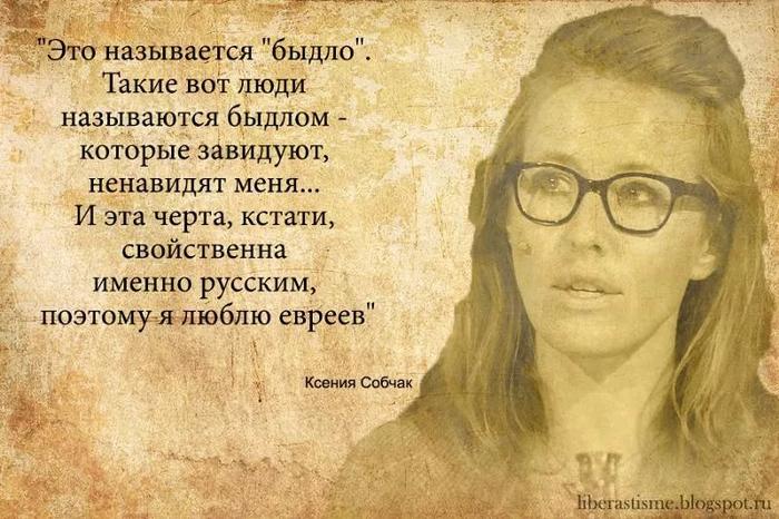 Если бы он просто сказал, что собчак такая - же тварь, как и её папаша - вор и клятвопреступник, и что она так же как и он, за бабло готова торговать территориями России и на этом остановился, то я бы его поддержал, так как шлюхе, живущей на наворованные питерские квартиры у власти делать нечего, а пары лимонов баксов, которые она якобы "заработала", видимо раздвигая ноги везде и всюду, как наша "прима-балерина", за...