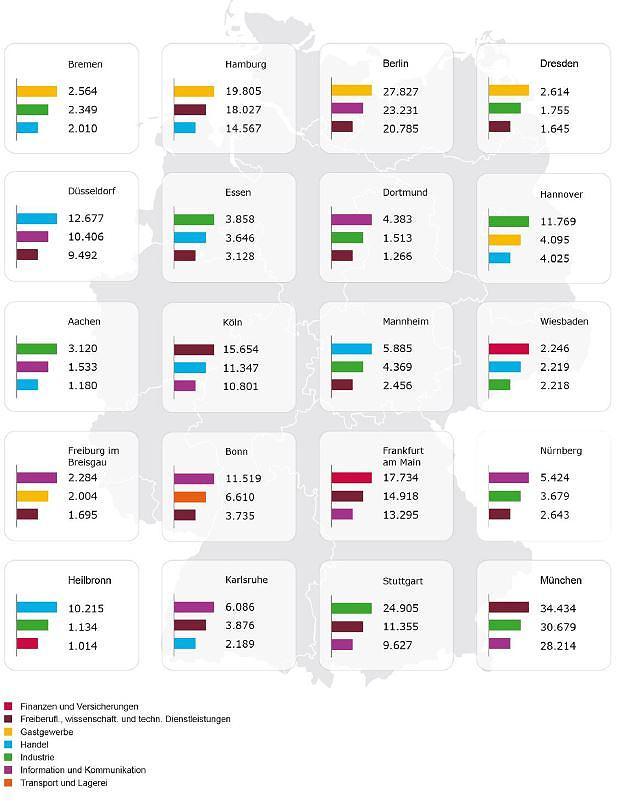 Информационно-коммуникационная отрасль: Бонне (11 500), Карлсруэ (6090), Нюрнберг (5420), Дортмунд (4380), Фрайбург (2280).