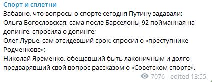 Путин считает, что повод мы все-таки дали, т.к. случаи были выявлены, как и в других странах. Но там такого ажиотажа нет. Ажиотаж в нашем случае связан и с политической подоплекой. С МОК нужно выстраивать отношения, спортсменам помогать отстаивать честь и достоинство в гражданских судах.