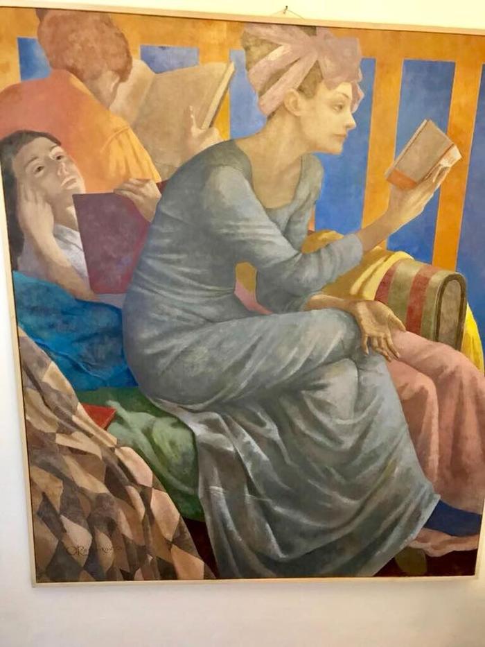 Итак, картина под кодовым названием «Чукчи-читатели». Центральный образ в одном синем носке явно получает море удовольствия от чтения книги, а его (её) левая кисть в сочетании с пальцами вчерашней девушки свидетельствует о том, что художник творил в реабилитационном центре больных ревматоидным артритом.
