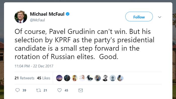 "Конечно, Павел Грудинин не может победить. Но то что КПРФ его выбрала как партийного президентского кандидата - это маленький шаг вперед в ротации российских элит. Хорошо."