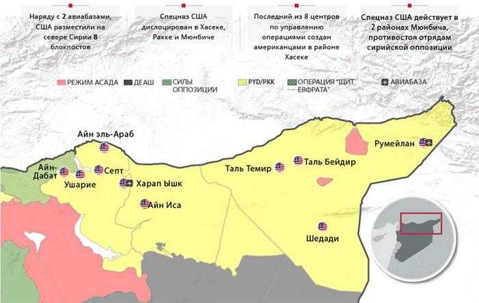 Информационные агентства «Россия сегодня» и «Спутник» доказали существование 10 американских военных баз на территории САР. Однако более точные данные предоставила иранская разведка, которая насчитала в Сирии 14 военных баз, в том числе 12 на севере и северо-востоке и еще две на юге страны. Кроме того, турецкие СМИ сообщили о существовании 13 складов американского оружия в курдских районах, которые расположены в непосредственной близости от американских баз.