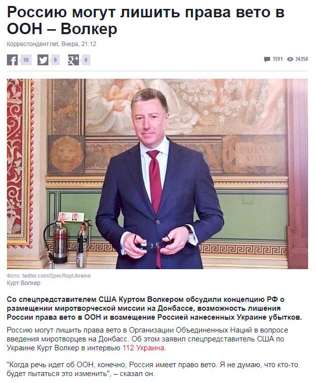Американский спецпредставитель по Украине Курт Волкер дал интервью программе «Завтра» телеканала «112 Украина». Речь в первую очередь зашла о результатах его переговоров с помощником президента РФ Владиславом Сурковым, которые проходили в ОАЭ. При этом украинские журналисты поинтересовались у Волкера, есть ли «шанс» лишить Россию права вето в Совете безопасности ООН.