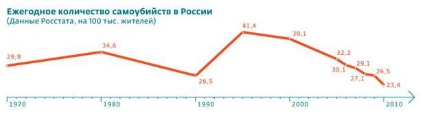 В конце прошлого столетия среди населения нашей страны наблюдалась настоящая эпидемия суицидов: ежегодно совершали самоубийство, по разным данным, от сорока до 60 тысяч человек56. При этом наблюдаемая во всем мире тенденция к «омоложению» суицида в России, и особенно в Москве и Санкт-Петербурге, проявилась гораздо значительнее. Оценивая показатели в нашей стране, ВОЗ признала, что Россия находится в состоянии чрезвычайной ситуации, поскольку в течение длительного периода показатель самоубийств в нашей стране существенно превышает установленный «критический уровень» - 20 случаев на 100 тысяч населения в год.