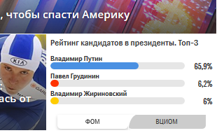 На сайте РИА-Новости публикуется текущий рейтинг кандидатов в президенты по данным ФОМ и ВЦИОМ. Топ верхних трёх рейтингов там висит постоянно и постоянно обновляется. В настоящий момент он выглядит так: