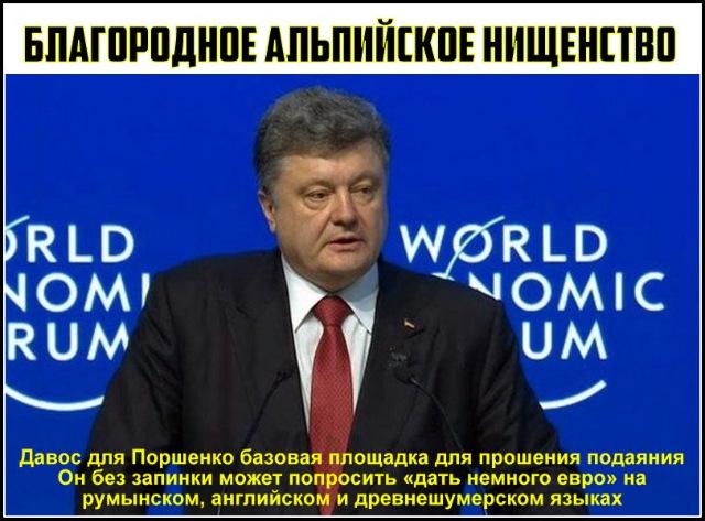 На 48-й экономический форум в Давосе украинская делегация во главе с П. Порошенко явилась с помпой. Украинский президент разместился в роскошном сьюте с видом на Альпы, в рамках форума впервые кормили не только украинским завтраком, но и работал украинский дом. Впрочем, завтраков от Украины было в избытке. Такое количество обещаний и сказок от Украины вспомнить сложно. Как охарактеризовал визит сам П. Порошенко, «результаты Давоса, если сказать одной фразой, — все было очень хорошо». Так и хочется добавить, «прекрасная маркиза».