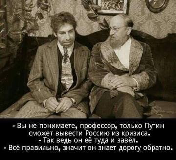 Всё верно!ПуКин со своими дружбанами все 18 лет грабили-грабили и ограбили,наконец,народ России до нитки. И теперь над их головами справедливо завис "домоклов меч" американских санкций,и этот "домоклов меч" вскоре упадёт на головы ПуКина и всех его дружбанов-бандюков и воров.