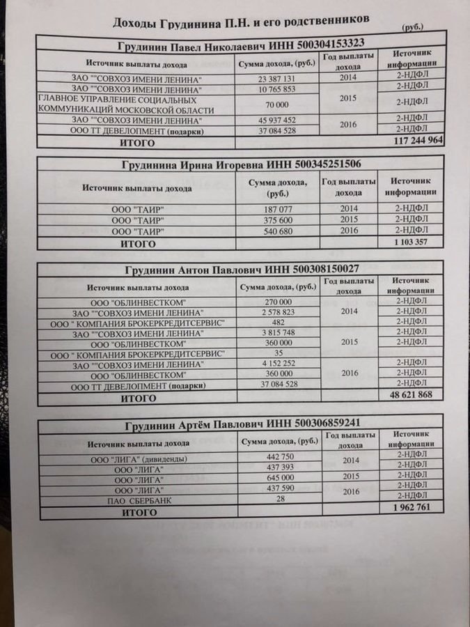 Концы с концами не сходятся, как ни крути. И получается, что при доходах, указанных в декларациях, ни один из членов семьи Грудинина не может позволить себе жить так, как он живет. Если конечно деньги не льются к ним на голову из волшебного рога изобилия, то получается, что красивую жизнь чете обеспечивает глава семьи, который, как уже известно многим, зарабатывает свои капиталы продавая и сдавая в аренду земли, которые в свое время украл у настоящих владельцев. Или все члены семьи под стать Павлу Грудинину и каждый занимается грязными махинациями в своем бизнесе.