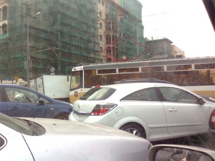 Уже за 3-м кольцом, напротив спорткомплекса Олимпийский, трамвай, проезжая на светофоре поперек проспекта, уперся в Газель. Газель, судя по всему, пыталась хитро объехать трамвай по встречке (иначе не могу объяснить такой итог). А итог следующий: от края до края перекрыто направление движения в центр. И это в час-пик!
