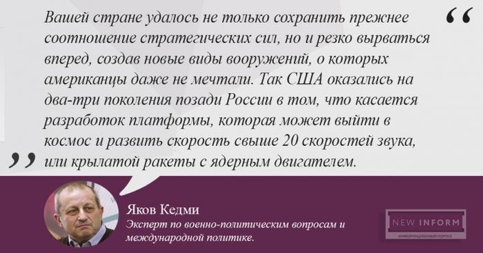 Кедми подчеркнул, что теперь , создав оружие, о котором в США пока даже не мечтали, Россия на два-три поколения обогнала конкурентов....