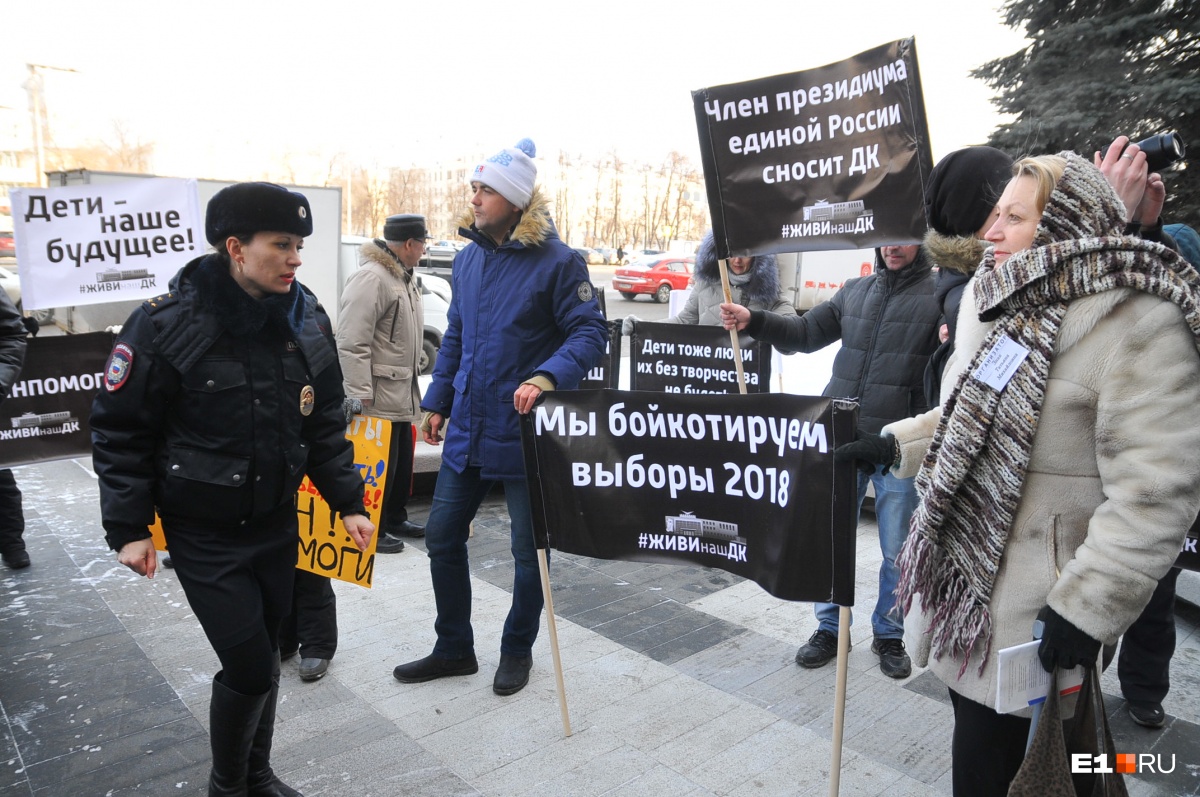 Перед зданием администрации собрались два десятка химмашевцев. Это в основном родители детей, которые занимаются в кружках ДК «Химмаш» на Грибоедова, 13. Они развернули плакаты с призывами спасти здание от сноса. Среди лозунгов были такие: «Дети — тоже люди», «Нет ДК — нет культуры», «Путин, помоги», «Живи, наш ДК «Химмаш», «Якоб, услышь нас», «Мы хотим танцевать, мы хотим побеждать». Дети вчера вместо занятий помогали родителям рисовать плакаты.