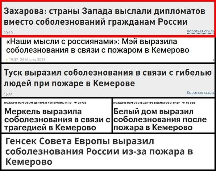Плевать, что речь идет о десятках детских жизней, главное связать анонсированную еще НЕДЕЛЮ НАЗАД высылку российских дипломатов со вчерашним пожаром в Кемерово!.Подсуетилась Манька!