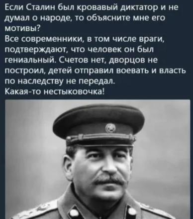Но тем не менее, как был Сталин преступником, бандитов и большой сволочью, так и остался. И никто и никогда не простит ему миллионов загубленных жизней, многие из которых являлись лучшими умами, цветом нации.