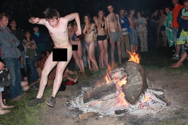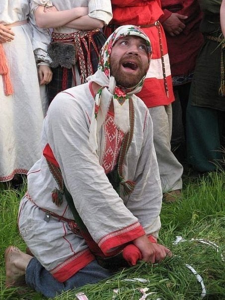Где-то под Киевом сидят эти ребята на природе, внешне - братва, отдыхают за столом, а среди них был предводитель язычества. И только мой знакомый взял вилку, чтобы наколоть святой шашлык, как тут голос: "А давайте песни будем петь!" - в общем, встает тот мужик, всех зовет подняться и начинает чего-то такое напевать языческое, да еще с жестикуляцией, глаза закатывает, руки вверх тянет! (просит всех тянуть!)