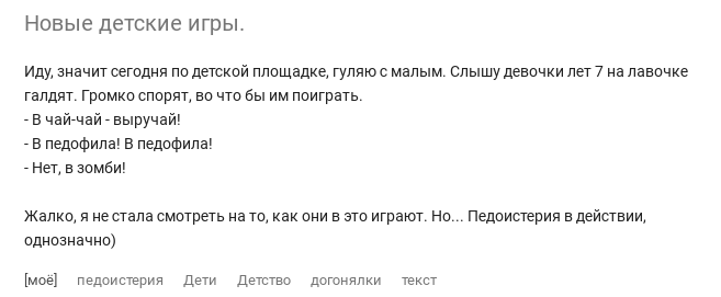 И тут такая мысль в голову пришла... А если эту педоистерию в обществе специально разводят. Ребёнку не поможешь, потом уже легче и взрослому не помочь, что бы самому не встрять.