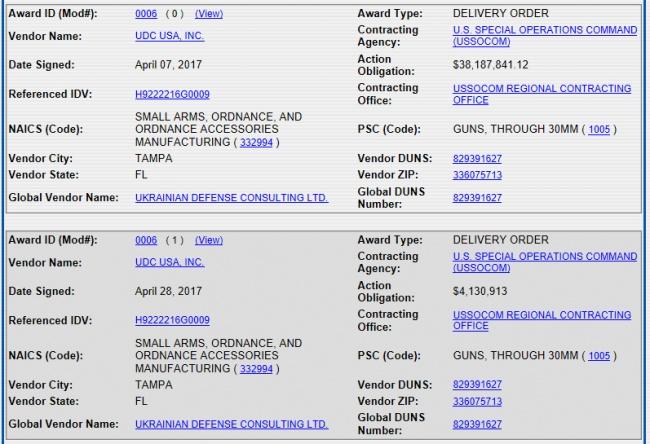 Поставками оружия занимается фирма UDC USA, по данным Федеральной системы закупок США, является частью компании Ukrainian Defense Consulting Ltd. («Украинский оборонный консалтинг»)