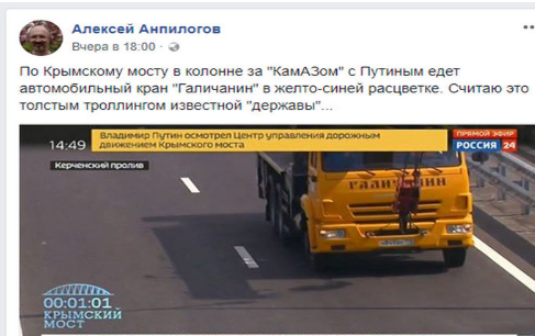 Если без жестов и символов, без анализа того, что НЕ БЫЛО сказано, посмотреть на то, как Путин открывал мост, то возникнет ощущение какой-то скромности действия. Никаких оркестров, разрезания ленточек, радостных толп, кучи речей, моря знамён, взлетающих шаров, салюта, раздачи наград. Всё очень и очень скромно. Путин в куртке и джинсах и несколько человек с ним приехали, заглянули в Центр управления движением, что-то там тихо обсудили, постояли вокруг КАМАЗов, как бригада перед началом работы, расселись по машинам и проехали по мосту.