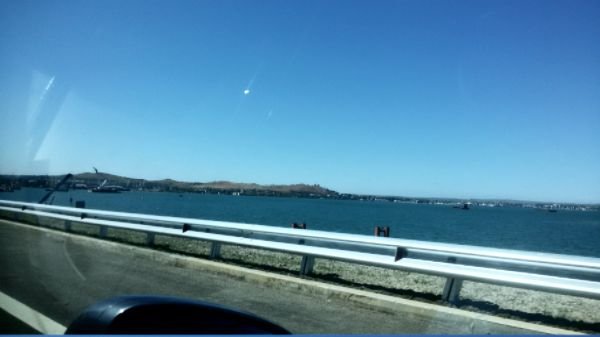 Увы. По нашей дороге мы проехали над Крымской трассой, а выехать на неё не смогли, съезды ещё не готовы. Прямиком прокатили до Тамани, и повернули налево. Дорога и мост видны, но как на неё выехать? Увидели двух дорожных работников. Спросили: "Впереди мы выедем на трассу?"