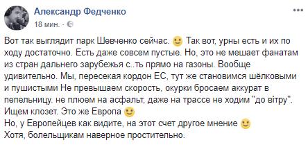 Но не будем отвлекаться от праздника футбола. Просто чудо, что никого не убили. Вот это я объяснить не могу. Местных ультрас глава МВД предусмотрительно предупредил: будете пи…ть иностранных фанатов – не получите зарплату и вам заблокируют доступ в патриотические паблики. Видимо, подействовало. Очень, кстати, удобно – держать всех местных отморозков в специальных «дружинах», «корпусах», чтобы они, значит, проявляли патриотическую позицию только по команде. Это, плюс постоянный поиск парадняков, где можно было отлить, способствовало избеганию кровопролития. Пятнадцать-двадцать мелких стычек после финала, где никому даже голову толком не пробили, вообще не в счет. Очень, кстати, ценный опыт для россиян: смело отключайте воду во время проведения Чемпионата мира, закрывайте туалеты, ломите цены в отелях и не обращайте внимания на прорывы канализации. В результате криминогенная ситуация резко улучшится. И да – побольше дебилов в мэры. Опыт Киева вам в помощь.