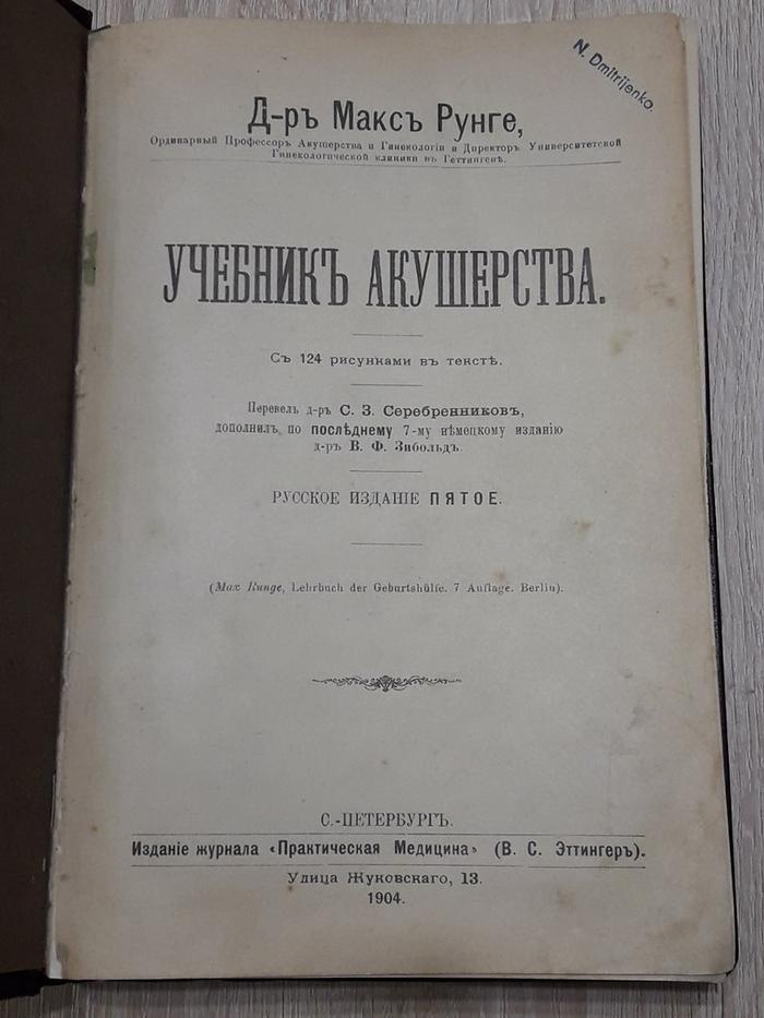 антикварное издание. Учебник акушерства доктора Макса Рунге. Книга издана в 1904 году в Санкт-Петербурге. Формат книги 24,5 × 17 см. 528 [535] страниц. В книге содержится 124 иллюстрации. На титуле присутствует штемпельный владельческий экслибрис. Отдельные тетради в книжном блоке несколько рассохлись, но утрат страниц нет, все листы на месте. Переплёт в очень хорошем состоянии.