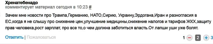 Зачем мне новости про Трампа,Германию, НАТО,Сирию, Украину,Эрдогана,Иран и разногласия в ЕС,когда я не слышу про снижение цен,улучшение медицины,снижение налогов и тарифов ЖКХ,защиту прав человека,рост зарплат, про все то,о чем должна заботиться власть.От лапши уши уже болят.