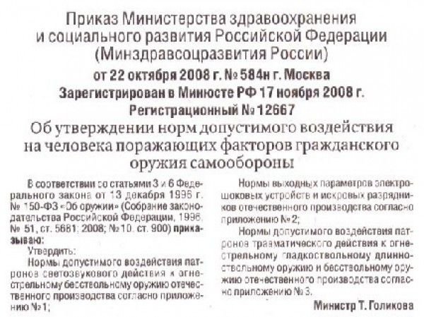 Министерство юстиции РФ зарегистрировало новые требования к оружию самообороны, утвержденные в приказе Минсоцздравразвития РФ. Министр Татьяна Голикова подписала поразительный документ, согласно которому оружие самообороны, легально продающееся в магазинах, не должно причинять преступникам телесных повреждений. Новые правила вступают в силу с 1 декабря 2008 года. В ответ на резонный вопрос, зачем нужно оружие, неспособное наносить нападающему телесные повреждения, и оружие ли это вообще, представители власти разводят руками. Министра Голикову можно понять: охраной чиновников занимается ФСО, сотрудники которого оснащены боевым оружием, способным защитить от любого нападения. Поэтому «вип-персоны» редко становятся жертвами преступников, и оружие самообороны им без надобности. А вот в отношении простых граждан России ежегодно фиксируется 3,5 млн преступлений, из которых почти треть – тяжкие и особо тяжкие. То есть убийства, изнасилования и грабежи. Как следует из документа, световые вспышки при выстреле из легального оружия самообороны не должны повредить преступнику зрение, а звук выстрела – слух. Пули из травматических пистолетов не должны травмировать преступника на расстоянии 1 метр, а если речь идет о длинноствольном оружии – то на 10 метрах дистанции. Легальные электрошокеры, и без того прославившиеся своей неэффективностью, не должны ранить кожу преступника и тем более «изменять его эмоциональную реакцию более чем на 10 минут». Последний пассаж выражает всю суть министерского приказа. Фактически гражданам России запрещается расстраивать преступников более чем на 10 минут под страхом уголовного преследования. «Резинострелы», которые продаются в оружейных магазинах, имеют недостатки, но они обеспечивают хоть какую-то защиту, — говорит бывший замначальника Управления лицензионно-разрешительной работы МОБ ГУВД СПб и ЛО, а ныне начальник Управления федеральной миграционной службы по Санкт-Петербургу и Ленобласти, полковник милиции Юрий Буряк. — В свое время в России из средств самообороны были разрешены только газовые пистолеты и револьверы – вот это действительно насмешка, а не оружие. Конечно, в идеале следовало бы разрешить нормальным законопослушным гражданам владеть короткоствольным оружием. Но депутаты боятся брать на себя такую ответственность, и их можно понять». Консультант оружейного магазина Сергей Тарасов продемонстрировал корреспонденту «Росбалта» результаты тестового отстрела по доске ДСП. «Большие дыры проделаны пулями «Осы», а прочие «резинострелы» оставили лишь вмятины, едва видимые глазом, — прокомментировал он. — Впрочем, у «Осы» есть другой недостаток – разного качества патроны. Если выяснится, что их мощность решили снизить, это будет проблемой. И так на рынке самообороны ничего толкового нет, так еще и «Осу» решили испортить». По словам Тарасова, покупатели часто рассказывают свои истории о применении травматики и, в основном, хвалят – кто от угонщиков отбился, кто громилу двухметрового задержал. В практической бесполезности большинства «резинострелов» уверен и начальник ОЛРР Петроградского РУВД Николай Кузин. «Все оружие, что появилось в последние годы, все эти «Макарычи» и «Викинги» — неэффективны. У нас проводились натурные испытания этих резинострелов, и когда мы увидели