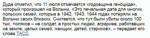Дуда отметил, что 11 июля отмечается «годовщина геноцида», который произошел на Волыни. «Это печальная дата для многих польских семей, которые в 1942, 1943, 1944 годах потеряли на Волыни своих близких. Считается, что тут были убиты около 100 тыс. поляков – не солдат, а простых людей, аграриев, работавших на земле, целых семей, женщин, детей, стариков», – передает его слова ТАСС.