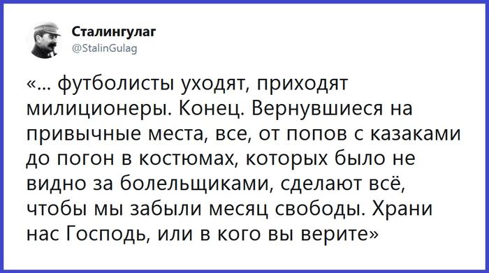 — Когда люди говорят, что после окончания Чемпионата опять все будет плохо, то «речь идет о политических противниках нынешнего режима, о людях, которые считают себя либеральной интеллигенцией… Эти люди не могут преодолеть свои политические пристрастия и абсолютно лишены возможности о чем-то трезво и объективно судить. Как скоро это так, то тогда и шансов у них никаких нет»
