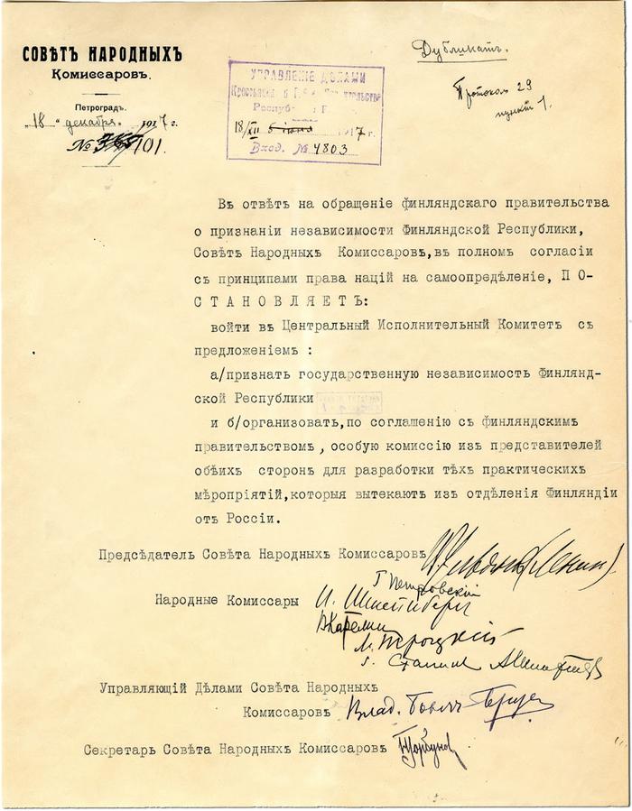 История финского государства берёт своё начало в 1917 году. Через полтора месяца после Октябрьской революции, 6 (19) декабря 1917 года парламент Финляндии одобрил декларацию о государственной независимости Финляндии. Уже через 12 дней — 18 (31) декабря, Совет народных комиссаров Российской Советской Республики принял Декрет о признании независимости Финляндии, подписанный лично В. И. Лениным.