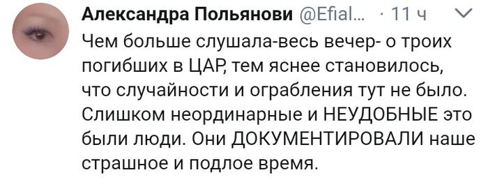 Отдельно хочется поговорить о заказчике документального фильма, на съёмках которого лишились жизни три человека: им выступил «Центр управления расследованиями» Михаила Ходорковского, который совершенно не озаботился обеспечением безопасности отправившейся в ЦАР группы журналистов. Более того, их поездка имела туристический характер – все трое не обладали аккредитацией и не имели оснований для ведения такой деятельности в стране.